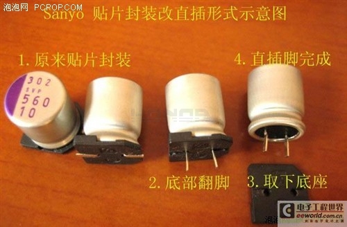 由上圖可以看出,貼片電容也可以改裝成直插電容使用,為什么要改裝呢?這是因為很多DIY玩家喜歡自己改造主板或者顯卡,直插電容可以用電烙鐵手工焊接,而貼片電容只能使用昂貴的貼片機進行焊接。去掉貼片變成直插解析過程如圖(圖3)